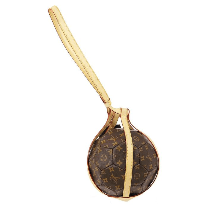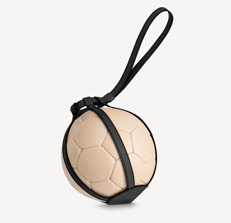 从图片可以精确的看出,LV与NBA的初次联名单品规划比较精约,以篮球形状作为包身,外表印满LV极具代表性的logo与斑纹,包身周围包裹着几条浅黄色的细带,看上去像极了篮球网包裹着篮球,而这也是这款单品最特性的当地。
