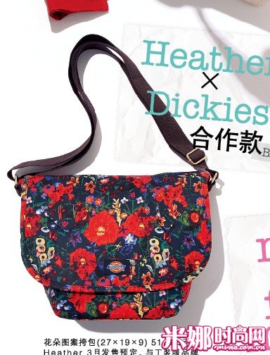 花朵图画挎包(27×19×9) 5145日元/Heather 3月出售预订。与工装服品牌“Dickies”的跨界之作。运动风格的斜挎包饰以大片花朵图画后发出女孩气味。开合部分的戏法贴,以及内侧和外侧的口袋都极大提升了包包的便携性。