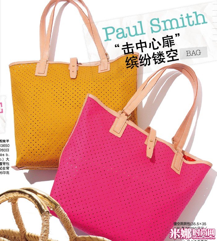 镂空洞洞包(35.5×35×9) 各26250日元/Paul Smith BAG(Paul·Smith Japan) 抢占主角矛头的亮眼色系。包体轻巧便利带着,皮革镶边凸显高档质感。内含相同质地化妆包。