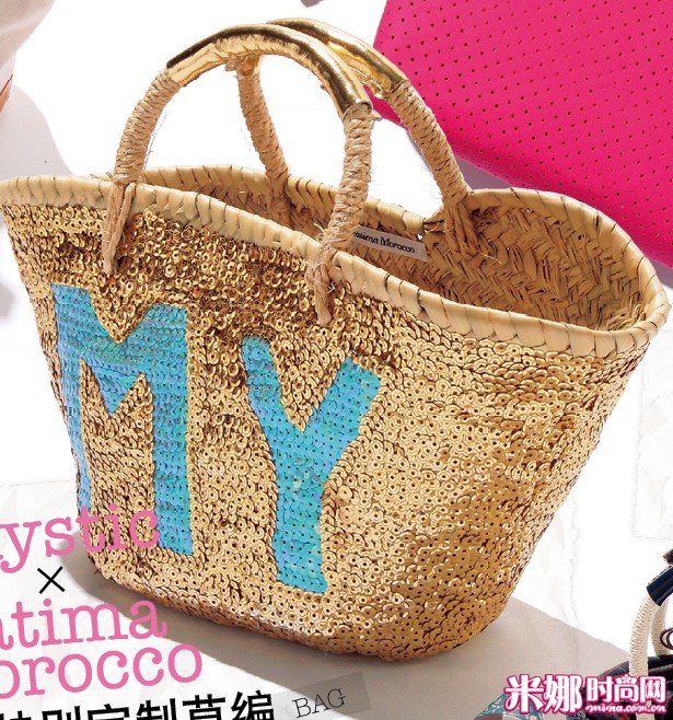 金色亮片饰MY LOGO字样草编包(19×37×12) 11550日元/fatima morocco×mystic(mystic原宿店) 每季最具人气的特别定制包包。耀眼的全体闪烁亮片,出售之际马上一抢而光。简练造型值得购入。