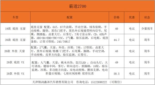 修改从天津锦润鑫泽轿车出售有限公司了解到,现在天津港直营店在黄金出售季,特举办促销不断送礼不断,各色彩车型样式完全,详细优惠可重视文章最下方联络方式。电话或许加微信到店都可享用贵宾待遇。