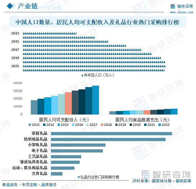 礼品行业下游最重要的包含终端消费者以及礼品回收商,中国是人口大国,消费者众多,截止2022年末中国人口数量达141175万人,另外,近年来中国经济快速的提升,居民人均可支配收入逐年攀升,2021年中国居民人均可支配收入达36883元,在消费升级趋势下,礼品市场需求有望逐步提升。目前中国礼品行业产品最重要的包含纺织用品礼品、小家电礼品、家居礼品、工艺品礼品、文具礼品、运动及娱乐用品礼品、游戏玩具类礼品、电子礼品等,据统计,家居礼品类产品采购占比高达27.8%,其次为纺织用品和小家电礼品,采购占比分别为26.3%和12.5%。