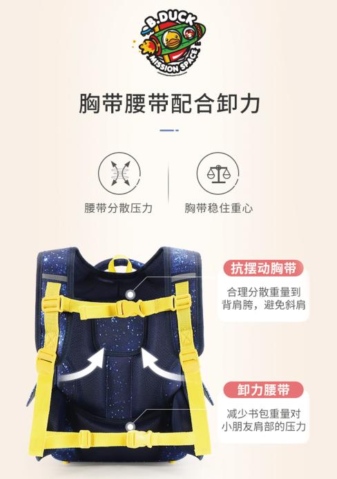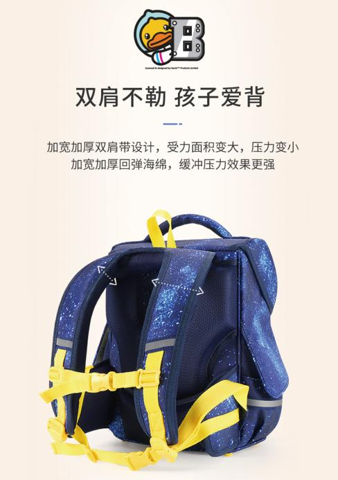 B.Duck 小黄鸭,用闪灯科技点亮孩子的脚步,带来欢乐和安全;以专业的护脊功用呵护孩子的脊柱健康,助力孩子生长。精品精研,赶忙给咱家宝物安排上吧!让孩子开开心心出门,健健康康长大!