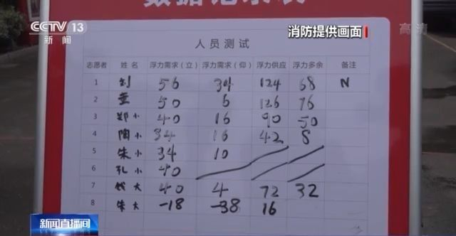 浙江宁波市消防救援支队特勤大队 朱一凡:另外两位踩水后只能保证头部露出水面,经过测量后我们得知,其中一人通过踩水可产生的推力为72N,而保持自身在水中直立需要40N,也就是说她只可提供32N多余的力,而一般成年人水中直立所需浮力至少50N,说明她在水中踩水产生的浮力很可能不足以救人。